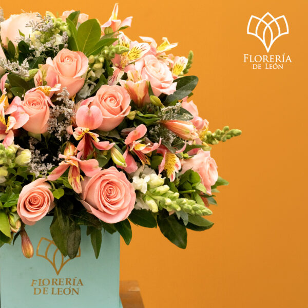 Esta caja está conformada por 24 rosas de tipo hermosa, caja de madera en color menta, follaje como caspia, perrito rosa y alstromelia de color.