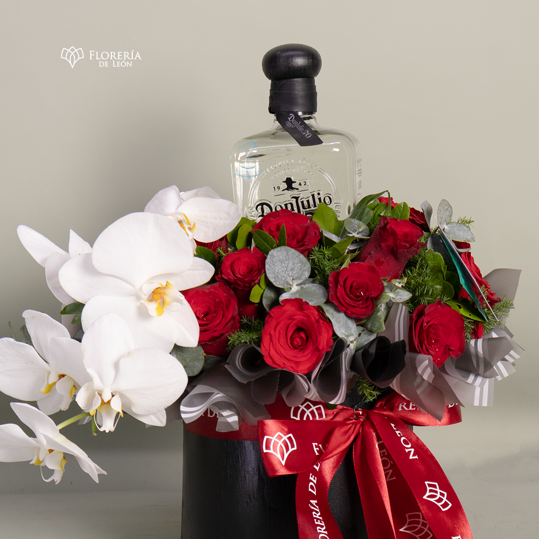 Una combinación que une el prestigio del Tequila Don Julio 70 con la delicadeza de las orquídeas blancas y la pasión de las rosas rojas. Presentado en una elegante caja negra, este diseño es la elección definitiva para quienes buscan un regalo imponente, equilibrado y lleno de lujo.