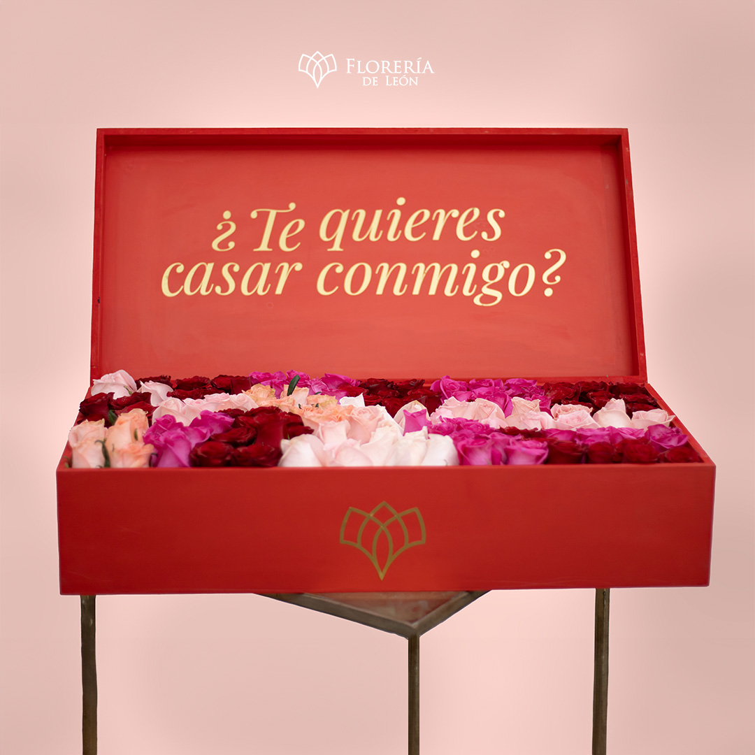 No dejes nada al azar en el momento más importante de tu relación. Esta imponente caja Mary es el cómplice perfecto para tu propuesta de matrimonio. Un mar de rosas premium en degradado resguarda la pregunta que cambiará sus vidas para siempre, creando un recuerdo que ambos atesorarán eternamente.