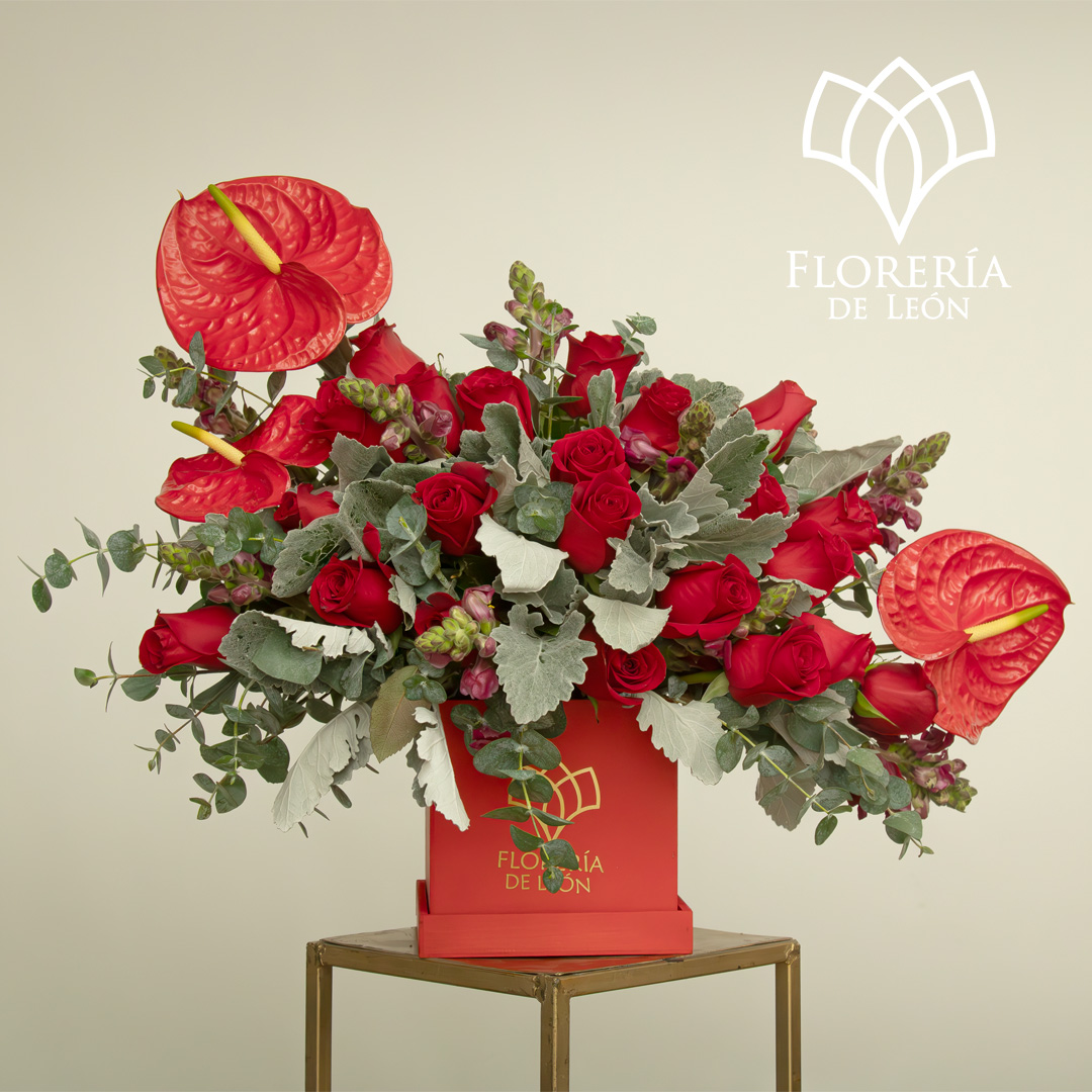 Un diseño sofisticado que fusiona la pasión de las rosas rojas con la elegancia exótica de los anturios. Acompañada de texturas aterciopeladas y detalles en eucalipto, esta caja premium es el regalo perfecto para cautivar y dejar una impresión inolvidable.