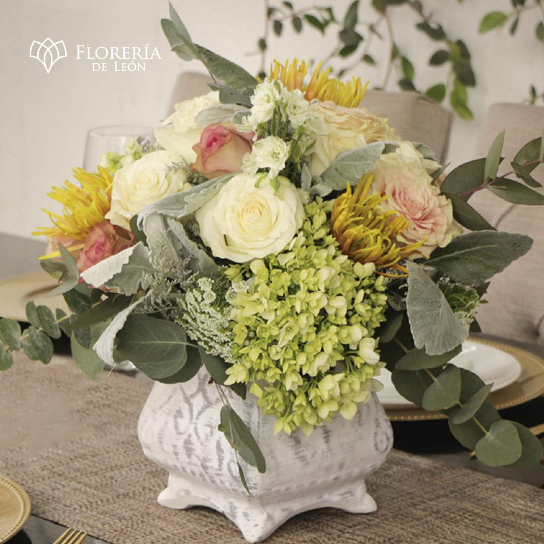 Este hermoso centro de mesa, con su diseño clásico y atemporal, es la pieza central perfecta para cualquier evento que busque un ambiente cálido y sofisticado. La armoniosa mezcla de flores frescas y follaje frondoso se presenta en una base de cerámica con un acabado artesanal, añadiendo un toque rústico y elegante a la vez. Cada arreglo es creado a mano por nuestros floristas expertos, lo que asegura que cada detalle sea perfecto. Nos adaptamos a los colores y la temática de tu evento, creando un diseño personalizado que complemente a la perfección el ambiente que deseas.