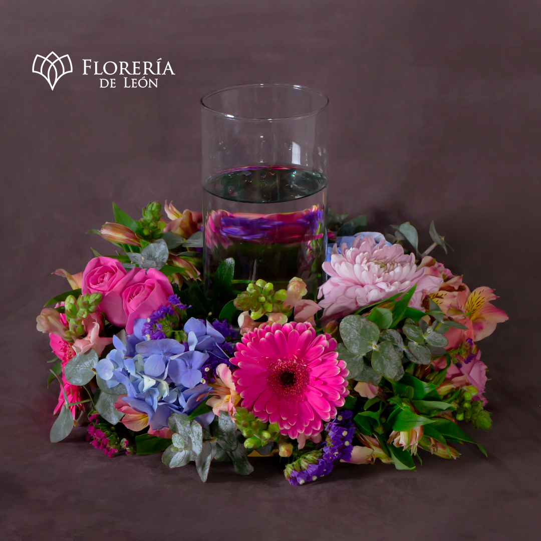 Un hermoso y elegante centro de mesa, perfecto para cualquier evento. Este diseño circular con un florero central combina una selección de flores de temporada y follaje fresco, creando un arreglo vibrante y sofisticado. Es ideal para bodas, quinceañeras o cualquier celebración, ya que lo personalizamos para que se adapte perfectamente a la paleta de colores de tu evento.