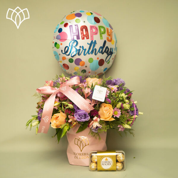 Regala la mejor opción para festejar sus cumpleaños: rosas y lisianthus con nuestro mejor producto llamado Alison, chocolates Ferrero Rocher de 16 piezas y globo de cumpleaños inflado con helio (el globo puede variar según la disponibilidad).
