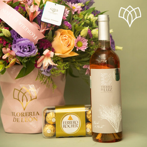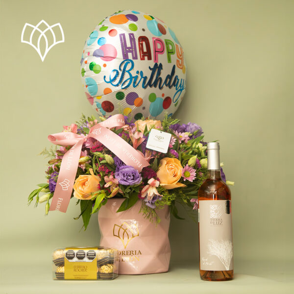 Regala la mejor opción para festejar sus cumpleaños: rosas y lisianthus con nuestro mejor producto llamado Alison, chocolates Ferrero Rocher de 16 piezas, nuestro delicado pero delicioso vino rosado Celia y globo de cumpleaños inflado con helio (el globo puede variar según la disponibilidad).
