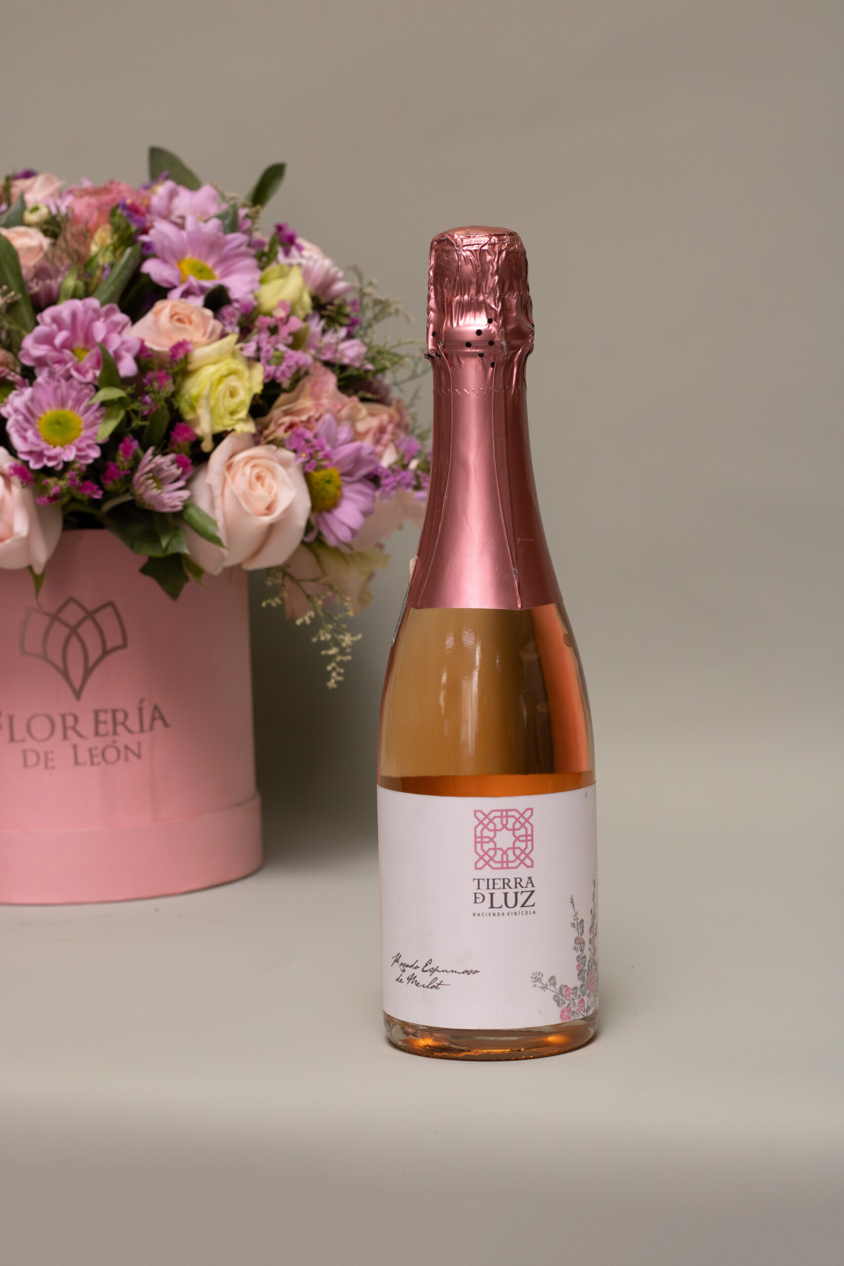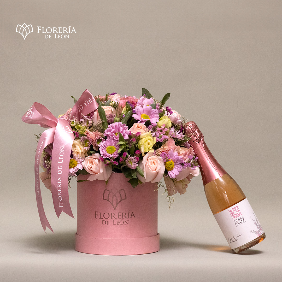 Una delicada selección de rosas, lisianthus y margaritas en tonos rosados y lilas, con una rica botella de vino espumoso rosado. Presentado en una elegante caja redonda rosa con un moño satinado. ¡Ideal para expresar dulzura y cariño!