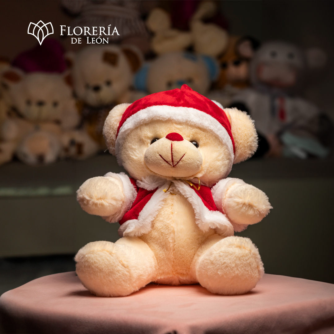 Lleva la alegría de las fiestas a casa con nuestro osito navideño más tierno. Vestido con su clásico gorro y capa roja de bordes blancos, este peluche de textura ultra suave es el regalo ideal para colocar bajo el árbol o sorprender a alguien especial en estas fechas. Un detalle de Florería de León que hará que cualquier rincón se sienta más acogedor.