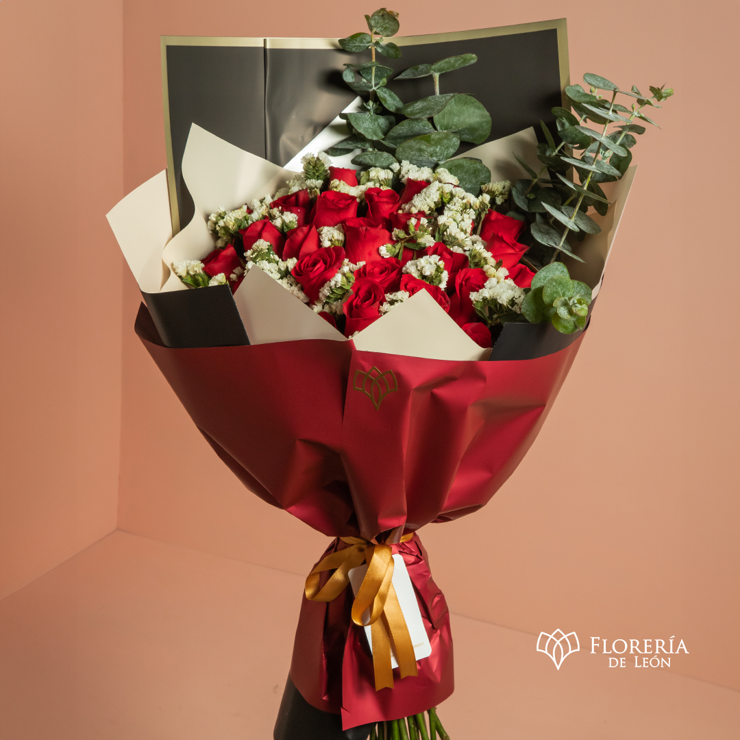 Ramo de 24 rosas rojas envueltas entre follaje y papeles finos.
