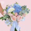 El ramo ‘Brittany’ es una fusión encantadora de romanticismo clásico y diseño moderno. Este bouquet destaca por su corazón de Hortensia blanca cremosa, que le da un volumen suntuoso, y una mezcla de Rosas en tonalidades que van desde el marfil hasta el fucsia intenso y el malva, inyectando un contraste vibrante y apasionado. La composición se enriquece con el verde aterciopelado de las hojas de Dusty Miller y pequeños acentos morados de Limonium o flor de relleno similar, creando profundidad y textura.